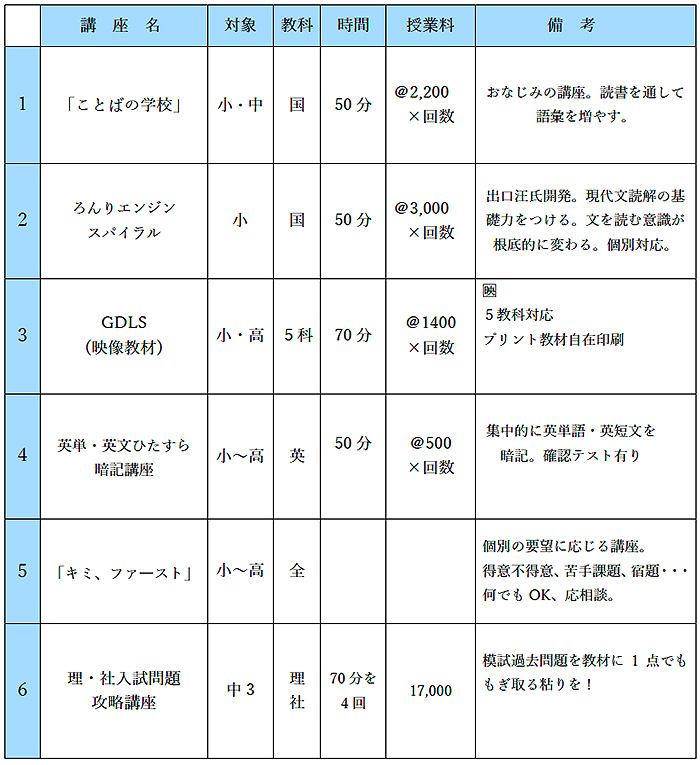 〇 遅刻/欠席の際は必ず授業前にご連絡ください。振替授業は、講習会期間中に行います。